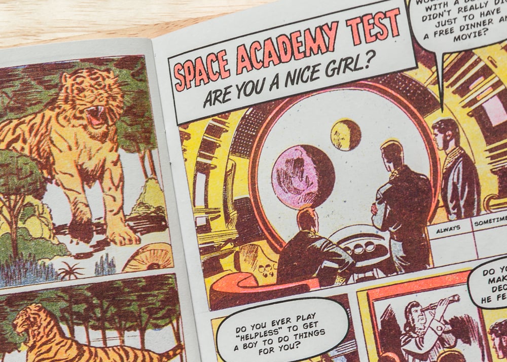 Tom Corbett Love Cadet – Twelve Ways to Get Over a Broken Heart, by Will Arnold, is a mash-up of Tom Corbett, Space Cadet comics with an advice column from a 1970’s issue of Falling in Love.