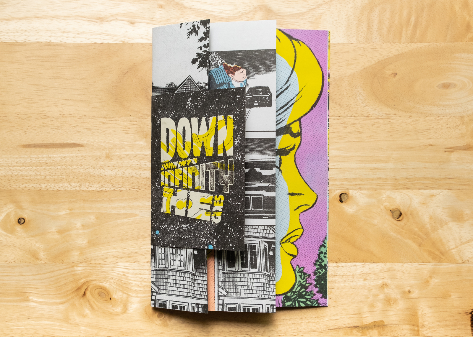 Down Down Into Infinity He Goes is the first in a four book series by Will Arnold. The series is structured around T.S. Eliot's Four Quartets. Though the books are semi-narrative, they each stand alone as individual poetic chapters. Each book is made of collages (analog and digital) of the source poems' text intermixed with text and images from a variety of comic book sources.