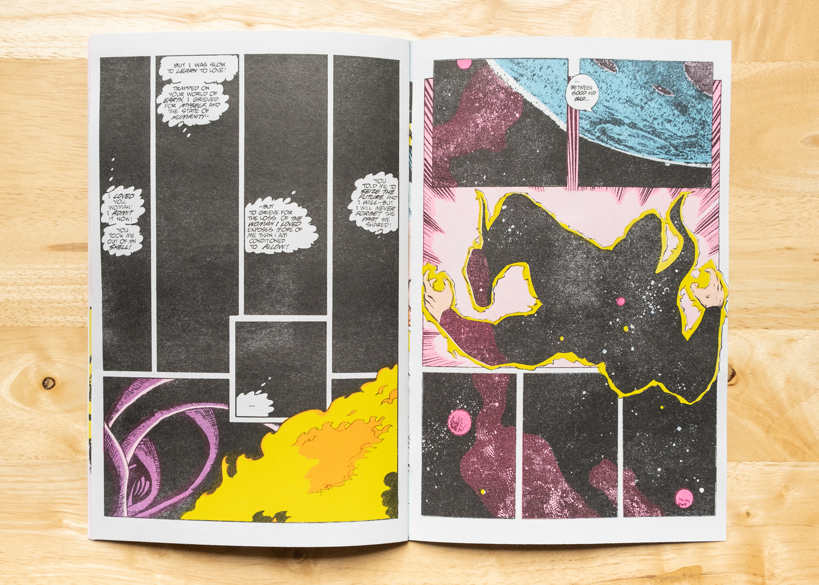 Down Down Into Infinity He Goes is built around the first of the Four Quartets, Burnt Norton. It's comic book source material includes Silver Surfer, Girls' Love Stories, Guardians of the Galaxy, Falling in Love, Booster Gold, Superman, Teen Confessions, Mai the Psychic Girl the Legend of Kamui, and more.