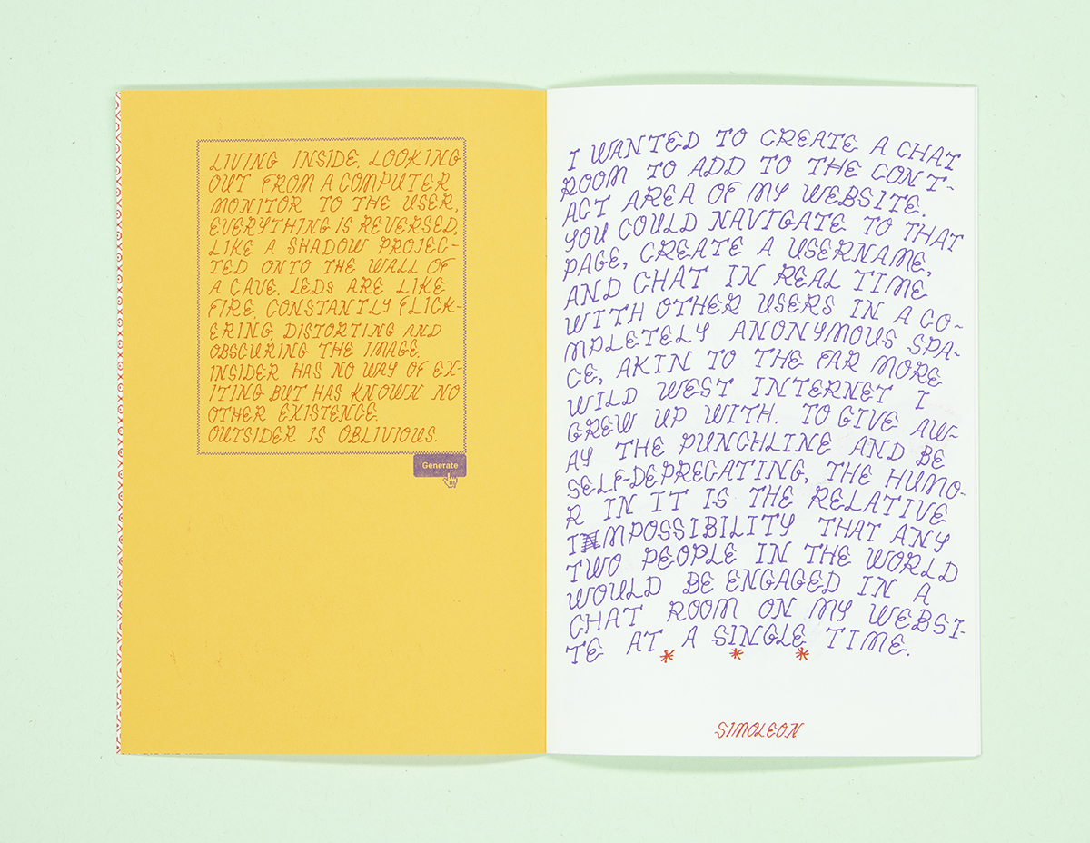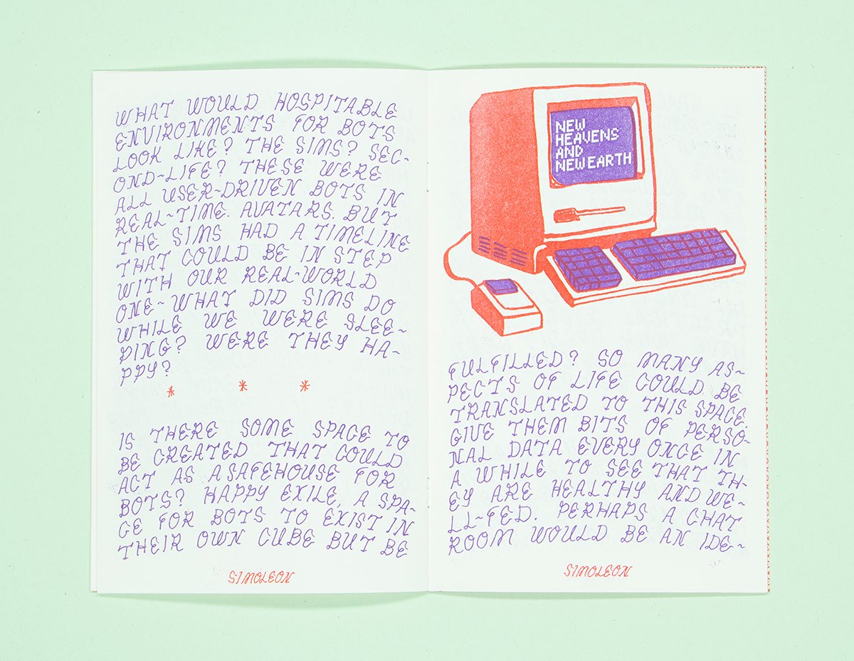 Simoleon explores the question "What would hospitable environments for bots look like?" through writing and illustration. The book comes with a link to an online webspace where you can explore a digital copy of the book, as well as enter a chat room space to discuss the project with others.